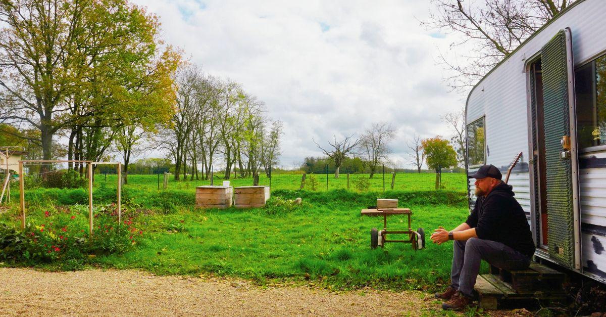 J.P. Kallio sitting on the steps of his caravan studio in Burgundy